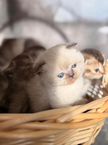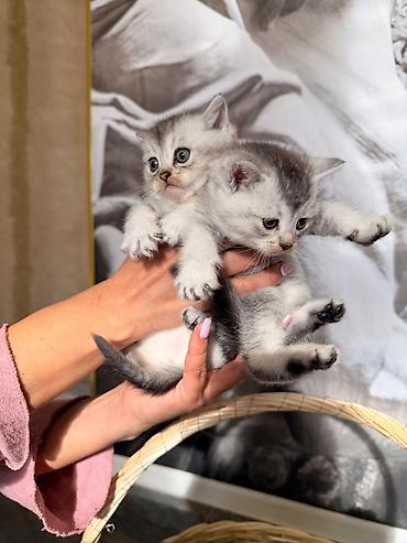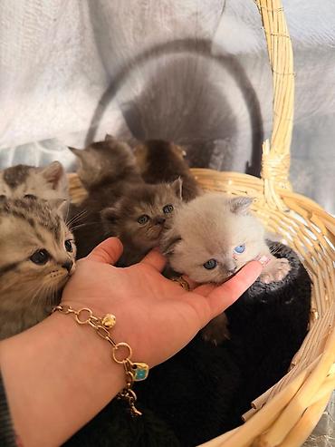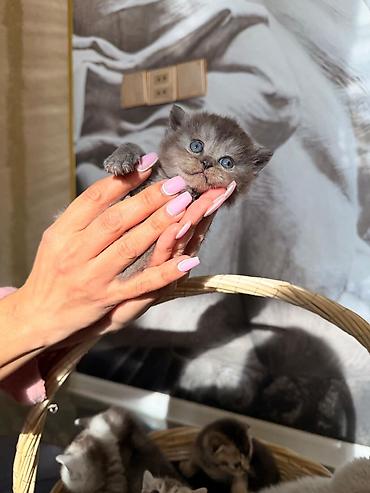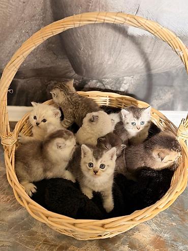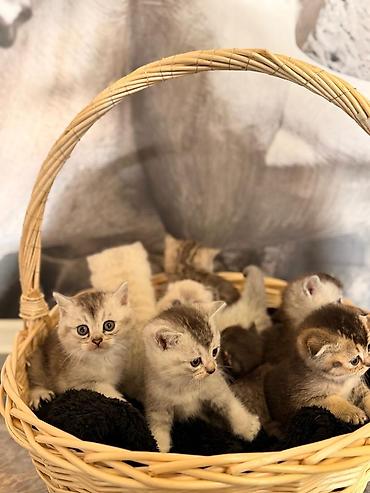 Səbətdə bir neçə bala mövcuddur; hərəsinin fərqli rəng və naxış kombinasiyası var. Şəkillərdə balaların yumru yanaqları, qısa quyrukları və tipik British Shorthair quruluşu aydın görünür. Yeni sahibinə uyğunlaşma dövründə əsas qulluq üzrə məsləhətlər verilə bilər.