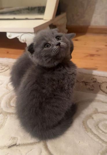 Skottiş Fold balası – unikal kürəkən qulaqları və iri mavi-boz gözləri ilə çox sevimli ev pişiyi. Rəng: gümüşü tabby (boz-ağ keçidlər, qarın və pəncələrdə açıq tonlar). Qısa, yumşaq tüklü örtük, yı...