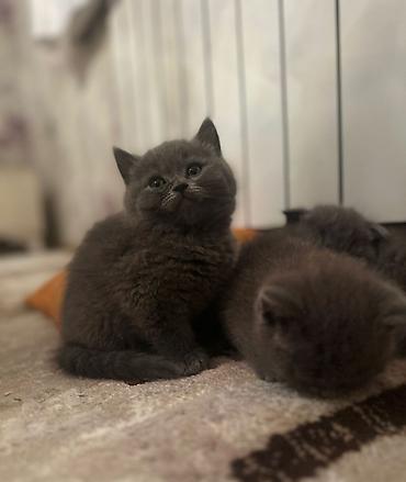 Britan (British Shorthair tipli) boz balaca pişiklər - Rəng: bərk boz (blue/boz), eyni tonlu balalar - Quşqulaq-qulaqlar yığcam, yumru sifət, qısa və sıx yun – klassik britan görünüşü - Sakit və m...