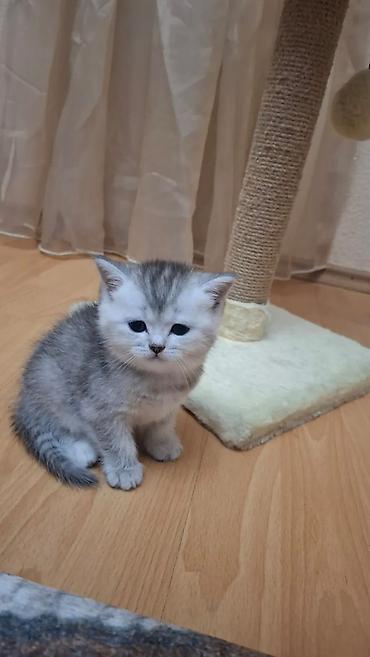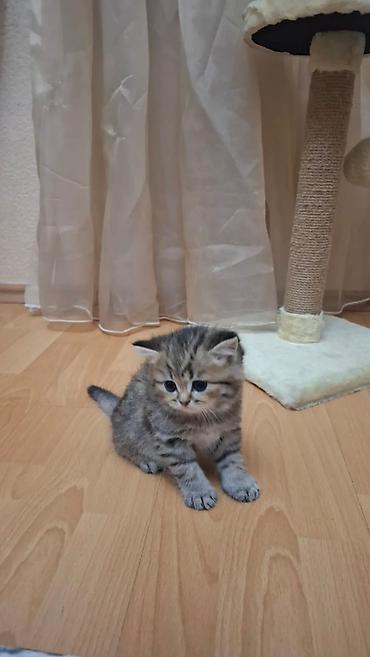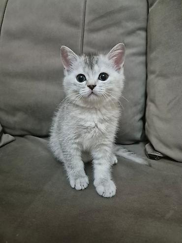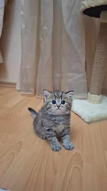 Şotland qıvrımqulaq (Scottish Fold) bala pişik - Rəng: boz, gümüşü naxışlı tüklər - Qulaqlar: qıvrım/qulaqcıqları önə doğru yatan tipik Scottish Fold forması - Kürk: qalın, yumşaq və tüklü - Gözlə...