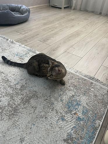 Skottiş Fold balası – boz cizgili - Cins: Scottish Fold (qıvrıq/qulaqları önə əyik) - Rəng: boz–kremsi tünd zolaqlı (tabby), qaralmış quyruq ucu - Gözlər: açıq yaşıl-boz tonlarında, iri və ifadəli...
