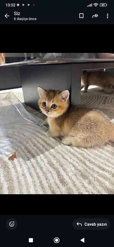 Qeyd: Şəkillərdəki balalar eyni zövlü, yumru sifətli “golden” British Shorthair tipindədir; sakit xasiyyəti və kompakt bədən quruluşu ilə mənzil şəraiti üçün uyğundur.