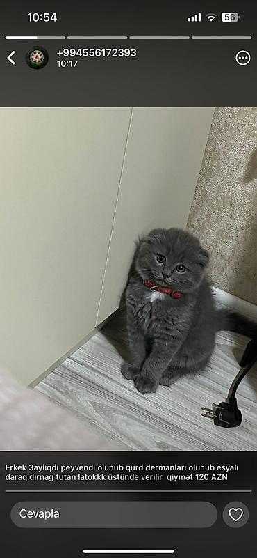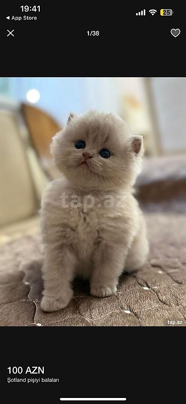 Skotliş Fold balaları – müxtəlif rənglər Xüsusiyyətlər: - Cins: Scottish Fold (qatlanmış qulaqlar) - Rənglər: qızılı-şabalıd (golden/shaded), krem-boz (silver shaded tipli), qara dumanı - Gözlər: ...