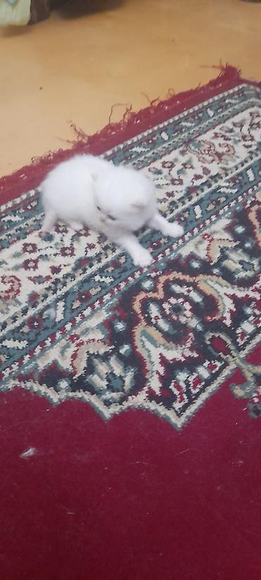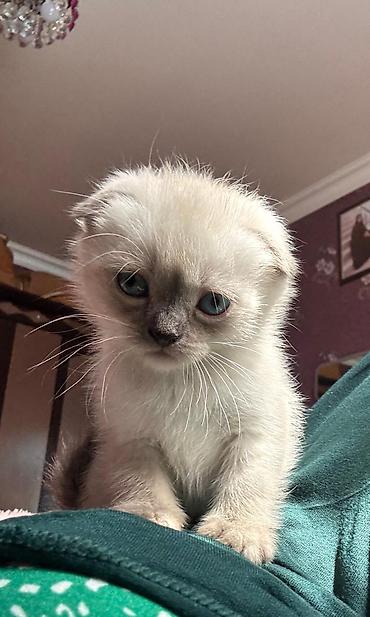 Britan/Şotland tipli (qatlanmış qulaqlı) balalar – mavi gözlü, krem-ağ rəngli.