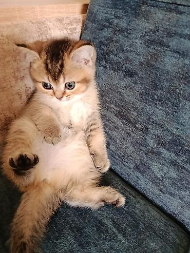 Şotland qıvrım qulaqlı bala pişik - Cins: Scottish Fold (qıvrım qulaqlı) - Rəng: qızılı-şabalıd tabbi (qara zolaqlı), yumşaq tüklü kürk - Gözlər: iri, dəyirmi, boz-yaşıl çalarlı - Qulaqlar: önə do...