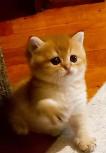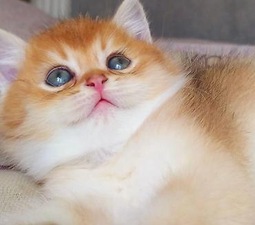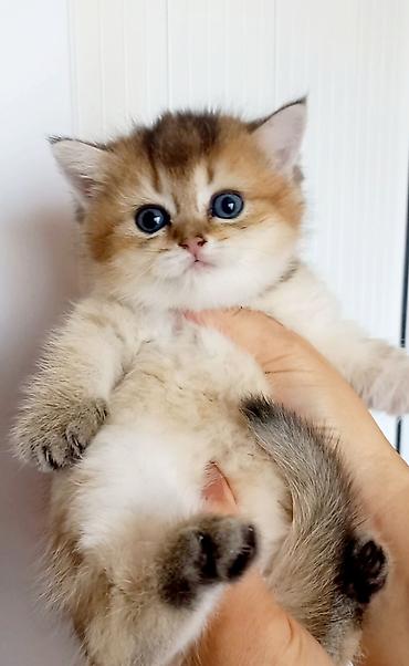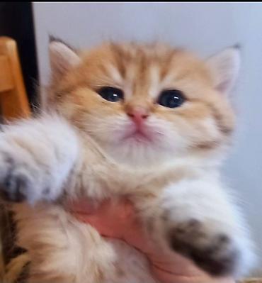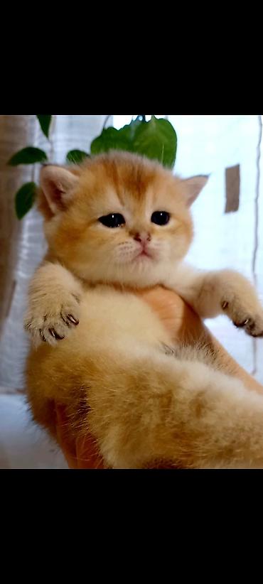 British qızıl rəngli pişik balası - Cins: British Shorthair (golden shaded/shell rəng) - Yaş: təxminən 1–2 ay - Xüsusiyyətlər: iri mavi-boz gözlər, yumşaq sıx tüklü kürk, yuvarlaq baş və kiçik qul...
