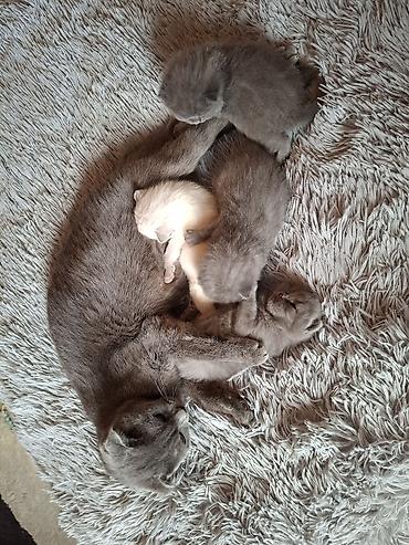 - Ana pişik eyni rəngli “blue” tonunda; balalar əsasən boz (blue), aralarında krem/ağ rəngli bala da var