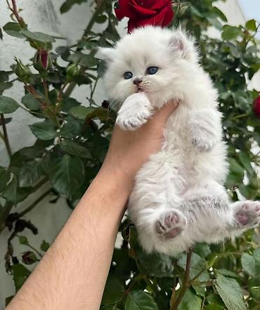 - Cins/xüsusiyyət: Qısa burunlu, dəyirmi başlı, sıx tüklü Britan tipli (British Shorthair/Longhair qarışığı görünüşlü). Yumşaq, krem-ağ tüklər, qulaqlarda və quyruqda tünd kölgə, iri mavi gözlər.