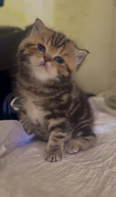 British Shorthair (Scottish tipli görünüşlü) balaca pişik balaları - Rəng: qızılı-şokolad tonlarında tük örtüyü, qara naxışlı (tabby) və isti krem alt ton; iri mavi-qara gözlər - Tük tipi: sıx, yu...