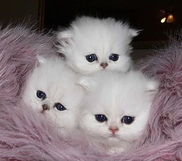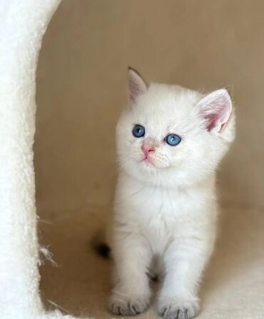 British tipli ağ balaca pişiklər - Cins: Britan (possible Shorthair/Scottish mix görünüşlü) - Rəng: qar bəyaz, bəzilərində çox açıq gümüş kölgə - Gözlər: iri, tünd mavi - Qulaqlar: birinin qulaqla...