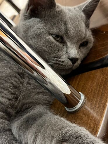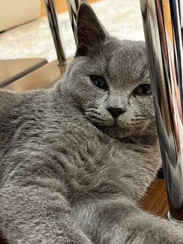 Britan tipli boz rəngli ev pişiyi Yaş Yarımdı . - Cins: Britan (qısa tüklü tip) - Rəng: Bərk boz (blue), yüngül zolaqlar görünür - Göz rəngi: qızılı-kəhrəba - Xüsusiyyətlər: yumru baş, iri yanaqla...