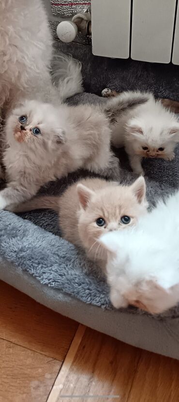 Britaniya qısa tüklü balalar – 3 ədəd Xüsusiyyətlər: - Cins: British Shorthair (yuvarlaq sifət, iri dairəvi gözlər, qısa və sıx tüklər) - Rənglər: iki ədəd krem/ağ (şaded), bir ədəd qızılı/cream s...