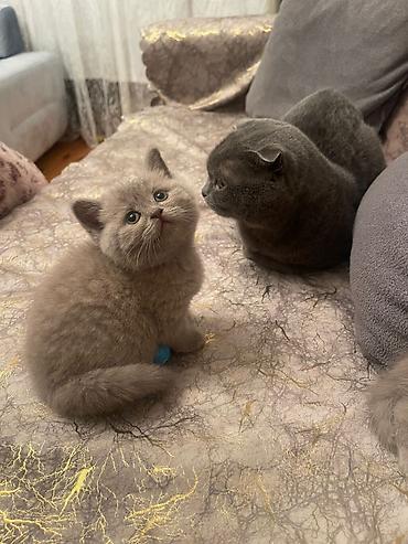 - Cins: Böyük ehtimalla British Shorthair/Scottish (qısa tüklü, bərk bədən quruluşu, yumru yanaqlar, geniş baş; şəkillərdə birində qulaqları qatlanmış ana pişik görünür)
