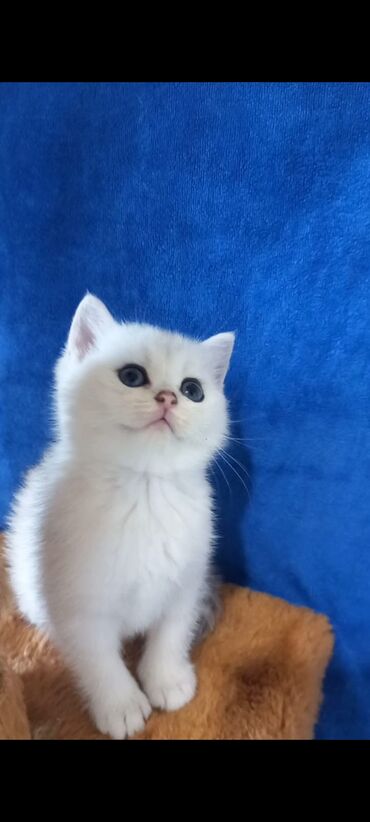 Britaniya tipli ağ pişik balası - Cins: Britaniya Şorthair (dəyirmi baş, dolğun yanaqlar, qısa və sıx tüklər, güclü bədən quruluşu) - Rəng: tam ağ, yumşaq və sıx yun örtüyü - Gözlər: mavi (balalıq...