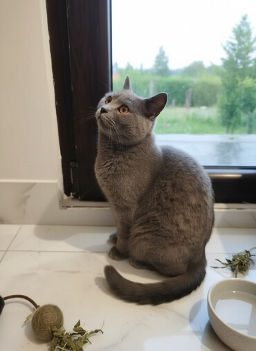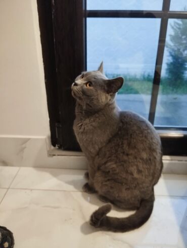 Boz Britaniya Şorthair tipli ev pişiyi - Rəng: bərk boz (blue/gray) - Yün: qısa, sıx və yumşaq teksturalı - Gözlər: iri, ifadəli - Bədən quruluşu: kompakt və əzələli, qalın quyruq - Aksesuar: yaşı...