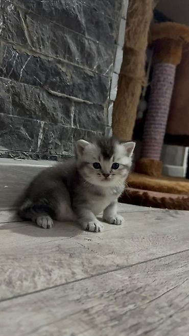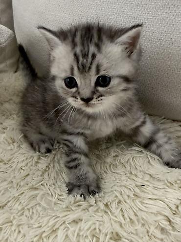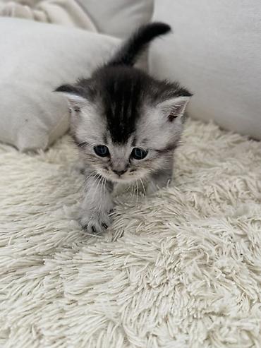 Britaniya (Scottish/ British tipli) balaca pişik balası Xüsusiyyətlər: - Rəng: gümüşü-şaded (ağ-gümüş tüklər, yumşaq zolaqlar), tünd burun və pəncə yastıqcıqları - Gözlər: iri, tünd mavi-boz - Qul...