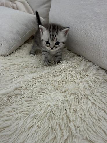 Britaniya qısatüklü balaca pişik balası - Rəng: gümüşi-tabby (boz tonlarda zolaqlı), qarın və pəncələrdə açıq krem-ağ ləkələr - Gözlər: iri, yuvarlaq, mavi-boz çalar - Quyruq: qısa və sıx tüklü - ...