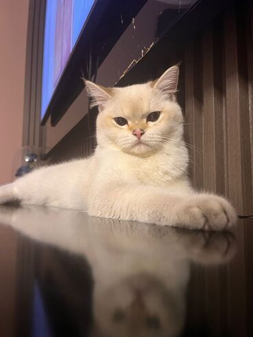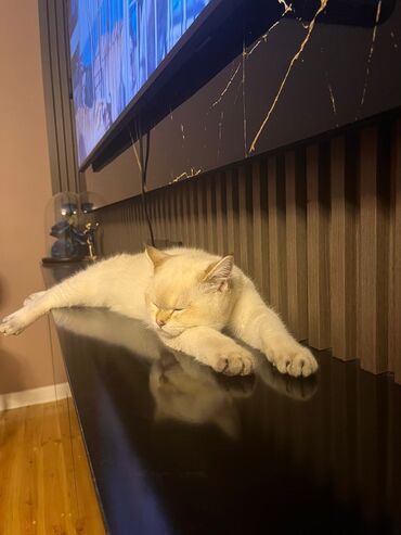 British tipli, açıq krem rəngli pişik. - Qısa, sıx və yumşaq tüklü kürk; bədən ağ-krem, qulaq, pəncə və quyruqda açıq boz tonlar. - Gözlər açıq mavi. - Sakit, ev şəraitinə uyğun, insanların yanınd...