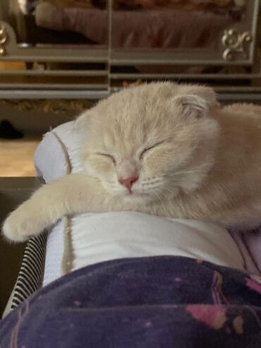 Skottiş Fold balası – krem-boz rəngli, mavi gözlü - Cins: Scottish Fold (qatlanmış qulaqlar) - Rəng: krem-boz (gümüşü tonlu), quyruğu daha tünd boz - Gözlər: parlaq mavi - Ev həyatı: divanda, yast...