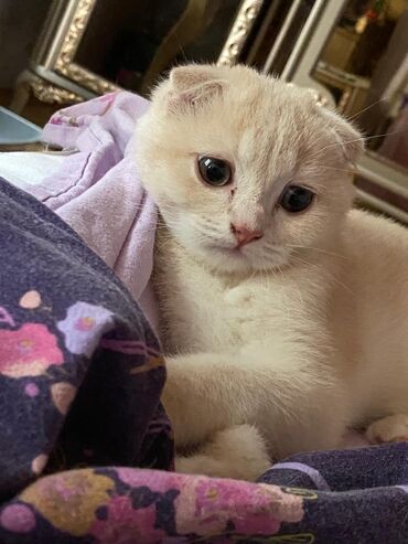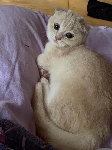 Şotland kıvrımlı qulaq balası – krem/ağ rəng palitrası - Cins: Scottish Fold (qıvrıq qulaqlı) - Rəng: ağ-krem (gümüşü kölgə), iri tünd mavi/göy gözlər - Xəz: qısa, sıx və ipək kimi yumşaq - Qulaql...