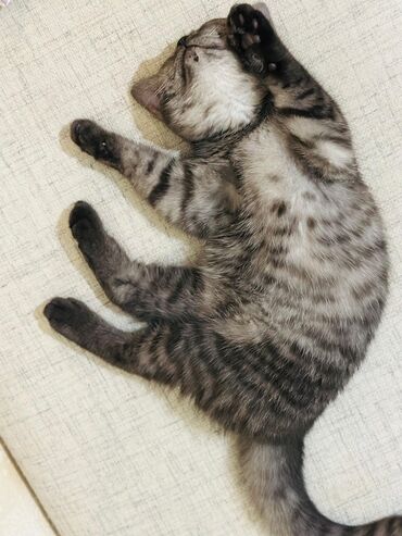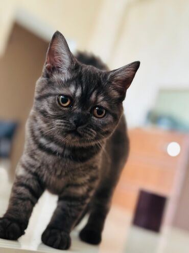Britan tipli boz zolaqlı pişik balası - Cinsəxüsusiyyətlər: qısa tüklü, gümüşü‑boz zolaqlı rəng (tabby), iri kəhrəba gözlər - Xarakter: sakit və mehriban, insanla ünsiyyəti sevir, ev şəraitinə uyğ...
