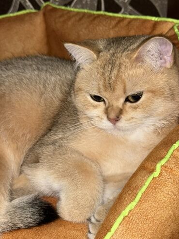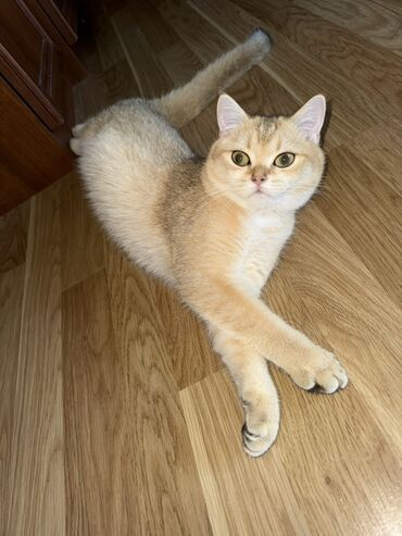 Britaniya qızılı şincilla rəngli pişik - Növ: Ev pişiyi, qısa tüklü (golden shaded/chinchilla rəngi) - Xarici görünüş: Zərif bədən quruluşu, iri yaşıl gözlər, qızılı-krem tonlarda yumşaq tüklər, q...