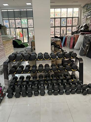 Məhsul: Dumbbell setləri və rəflər - Növ: Qumbaralı (hex) rezin örtüklü dumbbelllər, dairəvi rezin uclu peşəkar dumbbelllər - Çəkilər: Kiçikdən böyükə qədər geniş interval (şəkillərdə 10 kq, 12.5 ...