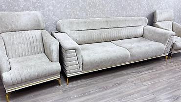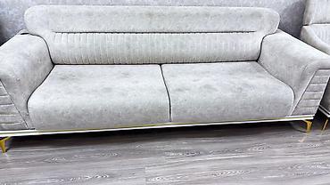 Məhsul: Yumşaq mebel dəsti – divan və iki kreslo - Rəng: açıq boz - Material: məxməri toxumalı yumşaq parça, dolğu yüksək elastik süngər - Komplekt: 1 geniş 3-yerlik divan + 2 ədəd kreslo - Komfor...