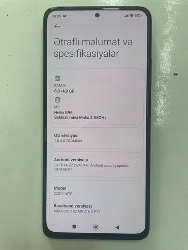 - Sistem: Android 13 hər şeyi işləyir heç bir problemi yoxdu heçnə dəyişməyib heseyi zavodu açılmayıb telefon təmirdə olmayıb super vəziyyətdə heç bir cızığı yoxdu super zaratqa saxlayır bir qram donmaq yoxdu idyaldi .