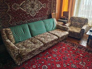 - Rahat oturuş üçün yumşaq süngərli divan və kreslolar, xırda floral naxışlı parça üzlük