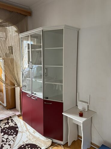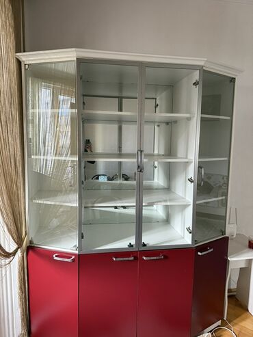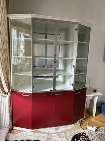 - Rəng və material: Ağ korpus, tünd qırmızı (bordo) alt qapılar, alüminium çərçivəli şüşə qapılar və rəflər.