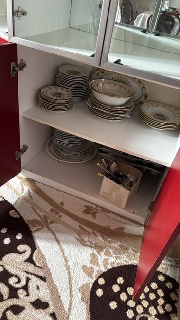 - Aşağıda geniş, iki mərtəbəli qapalı rəflər – iri boşqab dəstləri, qazan və aksesuarlar üçün.