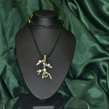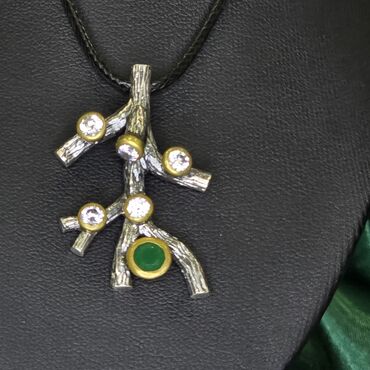 YaşılGümüş 925 prob budaq formasında olan bu asma boyunbağı, zərif dizaynı ilə diqqət çəkir. Üzərində ağ bülluru ve tebii yaşıl rəngli qaşlarla bəzədilib. Həm gündəlik, həm də xüsusi günlər üçün uyğundur.