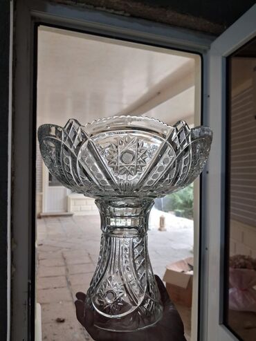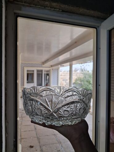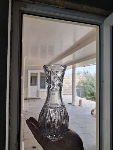 Bohemia kristal dəst - Bohemia kristal vaz: kəsimli naxışlı, hündürlük təqribən 23–24 sm (lent ölçüdən görünür). Üstündə orijinal “Bohemia Crystal” etiketi. Qiymət: 75 AZN. - Kristal səbət formal...