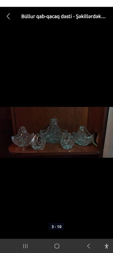- Dəstə əlavə olaraq dekorativ büllur qablar daxildir: orta ölçülü mərkəz qabı və bir neçə kiçik vazaya bənzər şirniyyat/mevze qabları. Kəsimli dizayn eyni üslubdadır, vitrin və ya süfrə bəzəyi kimi uyğundur.