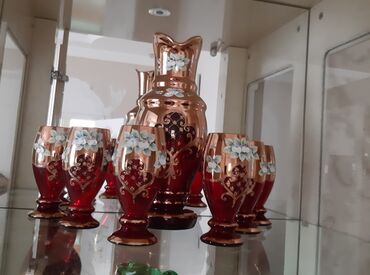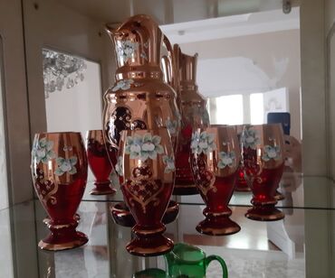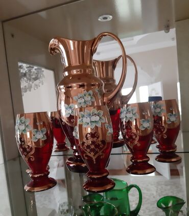 Qızılı-bürünc parıltılı dekorlu büllur sürahi və stəkan dəsti.