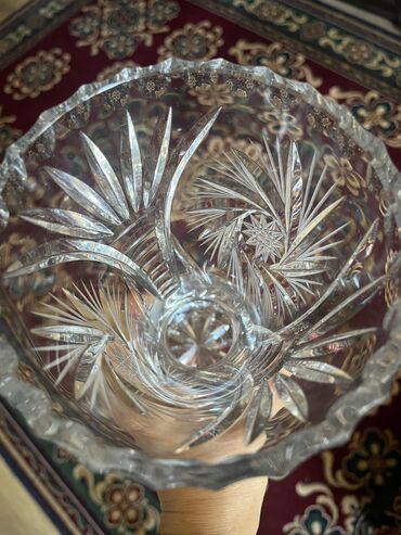 Kəpək naxışlı kristal vaza - Material: qalın divarlı kəsimli kristal şüşə - Dizayn: dərin oyma və geometrik naxışlar (ulduz və xətkeş motivləri), üst kənarda dalğalı haşiyə - Forma: silindrik-konu...