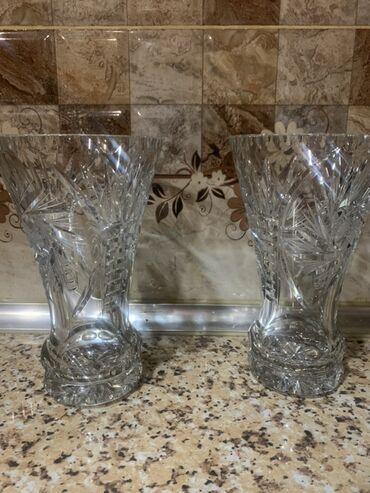 Klassik üslubda kəsim naxışlı kristal vaza dəsti (2 ədəd) - Material: şəffaf, ağır kristal şüşə - Dizayn: əl kəsimi effektli, dərin geometrik və bitki motivli naxışlar; işıqda güclü parıltı və pri...