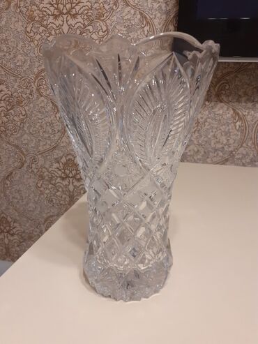 Kəsim naxışlı kristal vaza - Material: qalın, şəffaf kristal şüşə - Dizayn: əl işinə bənzər dərin kəsimlər, romb və ulduzvari ornamentlər; yuxarı hissə dalğalı kənarla - Forma: aşağıdan enli dayaq...