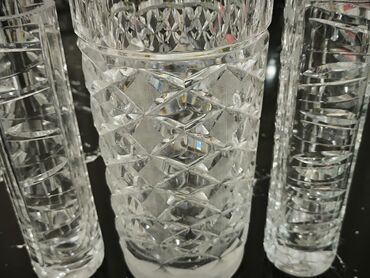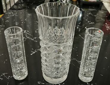 Kristal vazalar dəsti - Material: ağır və şəffaf kristal şüşə - Dizayn: dərin naxışlı oyma (romb və diaqonal kəsiklər), işıqda güclü parıltı - Komplekt: 1) Silindrik forma – hamar kənar, bütün ...