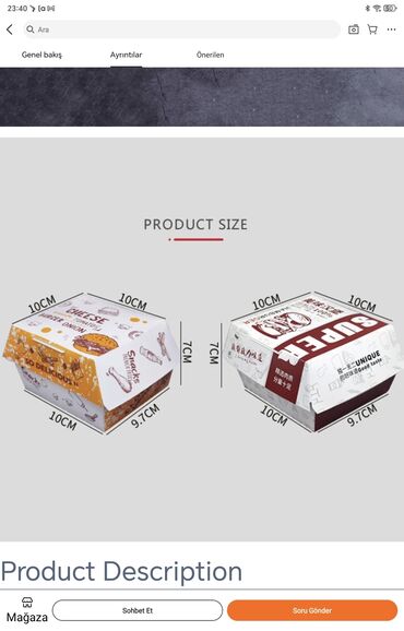 Fərqli dizayn və rənglərdə təklif olunan burger qutuları müxtəlif ölçülərdə mövcuddur. Bu qutular qida məhsullarının daşınması və təqdimatı üçün uyğundur. Asan qatlana bilən və istifadəsi rahat olan bu qutular, qidaların təhlükəsiz və gigiyenik şəkildə saxlanmasını təmin edir.