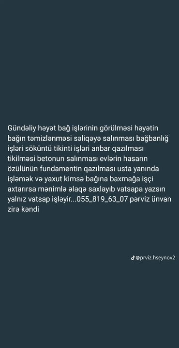 Gündəliy həyət bağ işlərinin görülməsi həyətin bağın təmizlənməsi səliqəyə salınması bağbanlığ işləri söküntü tikinti işləri anbar qazılması tikilməsi betonun salınması evlərin hasarın özülünün fundamentin qazılması usta yanında işləmək və yaxut kimsə bağına baxmağa işçi axtarırsa mənimlə əlaqə saxlayıb vatsapa yazsın yalnız vatsap işləyir...055_819_63_07 pərviz ünvan zirə kəndi