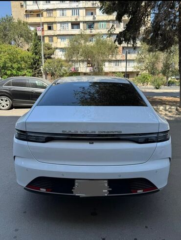 BYD Destroyer05-i hibrid sedan - Kuzov: ağ rəngli, aerodinamik liftback/sedan dizaynı, arxa hissədə tam eni boyu LED işıq zolağı və “BUILD YOUR DREAMS” yazısı - Güc qurğusu: plug-in hibrid DM-i si...