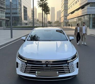 BYD sedan – ağ rəng, aerodinamik fastback kuzovlu. Xüsusiyyətlər: - Kuzov: 4 qapılı sedan, fastback tipli arxa hissə, tam LED ön-arka işıqlar, bütöv arxa işıq zolağı - Xarici dizayn: geniş xrom/qa...