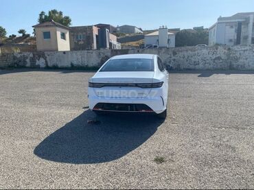 BYD Destroyer05-i hibrid sedan - Kuzov: ağ rəngli, aerodinamik liftback/sedan dizaynı, arxa hissədə tam eni boyu LED işıq zolağı və “BUILD YOUR DREAMS” yazısı - Güc qurğusu: plug-in hibrid DM-i si...