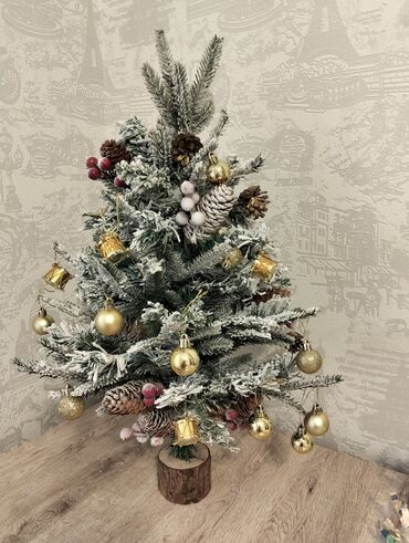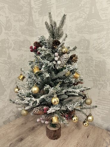 Süslənmiş süni Yeni il ağacı - Təxmini hündürlük: orta ölçü (təxminən 1–1,2 m) - Qar effektli şaxələr: uclarında ağ “qar” örtüyü bayram abu-havası yaradır - Dekorlar: təbii şam Qozaları, qırmızı g...