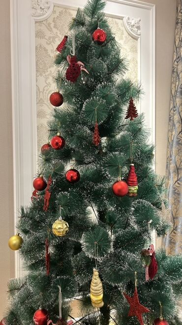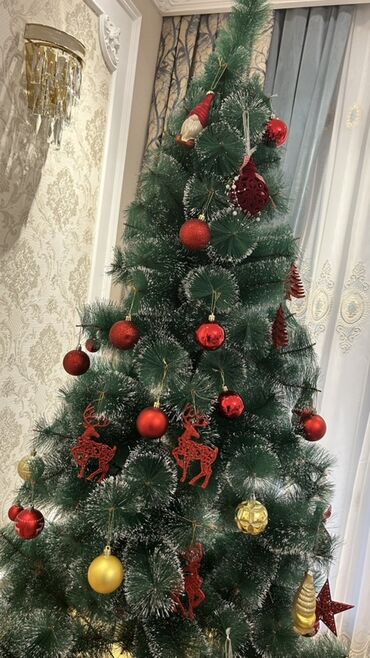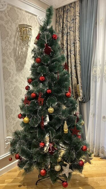 Süni Yeni il şam ağacı – tam dəst - Təxmini hündürlük: 1.9–2.1 m (otaq qapısı hündürlüyünə yaxın) - Şaxələr: sıx, iynələri yumşaq plastik, asan formaya salınır - Ayaq: qara metal, qatlanan, dayanı...