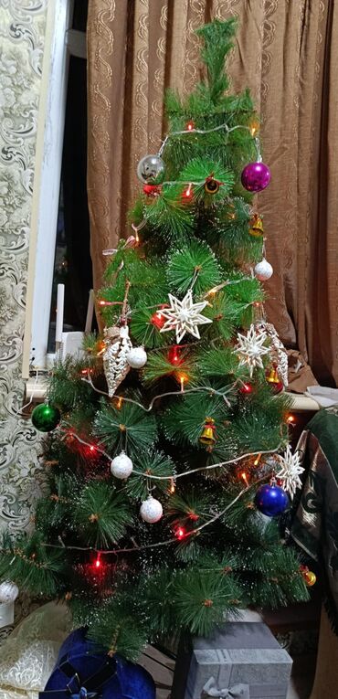 Yeni il şam ağacı – tam bəzədilmiş dəst - Hündürlük: orta ölçü (təxmini 1,6–1,8 m), konik forma, sıx budaqlar - Material: süni şam iynələri, metal/ plastik karkas, dayanıqlı altlıq - Üst bəzəyi: “...
