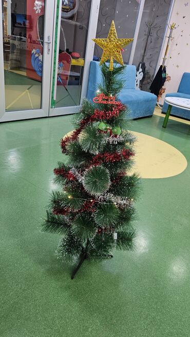 - Komplet: qızılı ulduz toppər, “Merry Christmas” yazısı, qırmızı və gümüş rəngli parıltılı girlyand (mişura), dekorativ yaşıl lent/bant