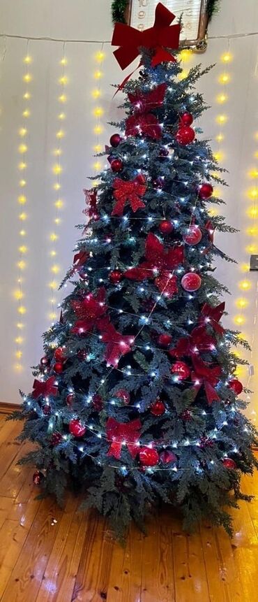 - Qırmızı tematik dekor: müxtəlif ölçülü top oyuncaqlar, parıltılı qırmızı lent və kəpənəklər, ponsetiya çiçəyi dekorları